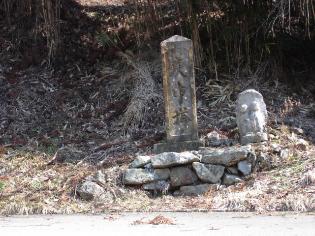 | 大根場は、大林山の西にある。2万5千図を見て、以前からその山名が気になって登ってみたかった山だ。今回、「さらしな三十山」というのを強引に作ったので、その中の一つに入れた。家からの距離もそれほど遠くないし、こんなシーズンでないと登れないヤブ山のように思えて出かけることにした。 事前にネットで情報を集めると、「信州山学クラブ」のHPにのっていたのでそれを参考に春山コースの方を登ろうと思った。冠着荘の前の道路に駐車して、見上げると、頂上から南西に向かって急な尾根が降りてきている。これを登れば近いだろうと思う。道平地区をぬけたところ尾根が道路に届いた所に写真の庚申塔がある。(ここから登れることを下りで確認。ここが登山口としていいと思う。)ここから登れるかな、と思ったが、山学クラブのHPにしたがいさらに林道を登る。すると「信州山学クラブ大根場登山口」の標識があったので、そこから沢に下り、南西主尾根へ向かって枯葉のつまったルンゼ状の場所を登りだす。 |