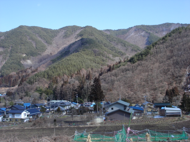 | 草湯地区あたりから見た大根場。中央の尾根にふみあと程度の道。中央奥あたりが1084m三角点。右側の方が標高は高くなっている。 写真のすぐ左に写ってはいないが草湯温泉「冠着荘」がある。 |