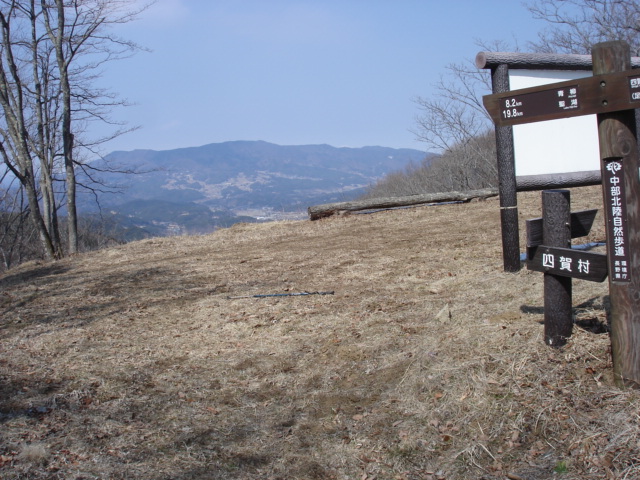 快適な尾根状の部分をしばらく行くと、登山者が一人下りてくるのに出会う。登り口に駐車してあった長野ナンバーの人だろう。大きいカメラを持っていたので、写真目的かなと思われた。山頂を平らに削ったような地形の山城跡に到着。北アルプス、聖山などの展望が広がっていた。アルプスはやや雪雲がまとわりついているような感じだった。 30分ほどであまりにもあっけなく登れてしまったので、少し物足りない感じがしたが、立峠の方も行ってみようと思っているので、そそくさと引き返す。 |