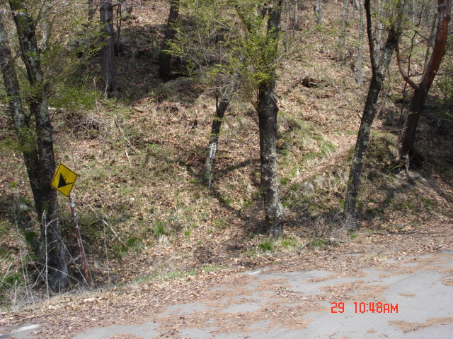 | 朝の出発前、「信州山歩きマップ」に絵地図があったなと思い見てみたがない。そこで「山岳巡礼」を見るとこの道の37号カーブの所から登りだす、とある。国土地理院の地図で見てみると、新しいトンネルができているようだ。四十八曲峠は今どんな様子だろうか。カーブに注意して走っていくと32号カーブ位の所で、古い道が閉鎖され、新しいトンネルが出来ていた。そこでトンネル手前の駐車帯に車を置き、閉鎖された舗装道路をしばらく歩く。写真の青い標識が35か6号カーブの標識、新しいトンネルの開いているピークが八頭山。この写真には木で見えないが新しく広い道がトンネル前に続いている。 | すぐに37号カーブの標識があり登り口があった。大林山の古い標識がとれて木にしばりつけてある。道ははっきりしていた。出掛けに「37号カーブの標識」という言葉を見なかったら、登り口を探すのに手間取ったことだろう。 |