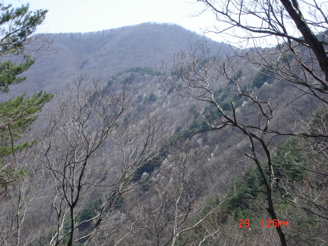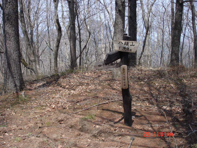 | しばらく登った山頂は、カラマツの広々した植林帯だった。山頂部の北側の端には八頭山、四十八曲峠や大林山への道を示す新しくしっかりした道標もあった。作ったのは千曲市みどりを守る会とあった。三角点の無い山はこういうものがあると登頂感があり、うれしい。後の山は冠着山。お昼にパンを食べだすと、ブヨのようなものがたくさん集まってきた。イノシシの跡などがたくさんあったので、動物が多く住んでいるのかも、と思う。 | ちょっと物足りなかったので、大林山まで行ってみる事にする。この写真は、帰りに撮ったのだが、登り口から稜線までの間に見える大林山である。手前の大林山までの稜線の斜面に白っぽく見えるのはコブシの木。さっき休憩した分岐まで戻り、大林山へ向かう。なだらかな稜線を登ると、マツタケ山の立ち入り禁止のビニールテープなどはってある場所にそってゆるく登っていく。 |