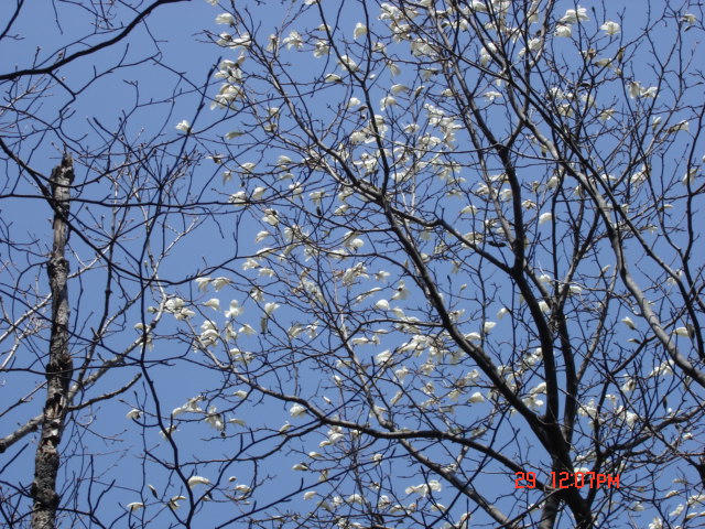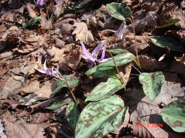 | 東側の斜面にはこぶしの木がたくさん生えていて、今盛りだった。 | 稜線が大林山の山頂部とぶつかるあたり、自在山からの縦走路が登ってきていた。そのあたりにカタクリの花がポツポツと咲いていた。群生地とまではいかないが、大切にすれば群生地になりそうだった。北斜面で雪が多い場所はいいのかもしれないな。(これも帰りに撮った写真です。) |
