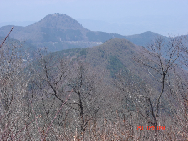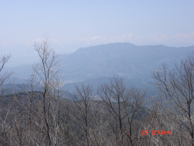 | 山頂からは今登ってきた八頭山(手前)。また冠着山(富士山形)が良く見える。 | 聖山の向こうに北アルプスがぼんやり浮かんでいる。黄砂などの影響なのだろうか、昔はもっと連休頃は青空だったような気もするが・・。気のせいか。ちょっと休んで同じ道を下る。考えていたより距離的にもあるようだった。大林山山頂から1時間弱で登り口に戻ってこれた。 |