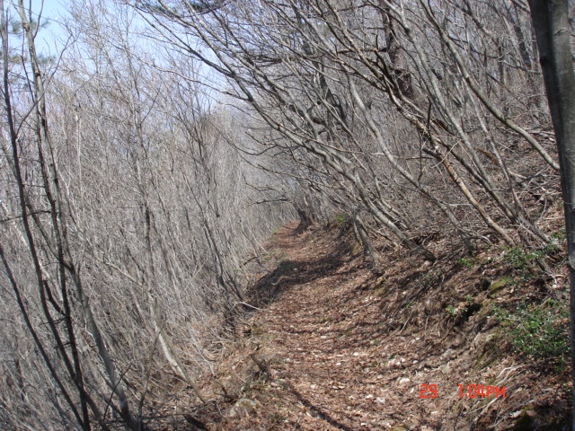 | カタクリの咲いている所から直登するのかと思っていたらそこから道は右側に巻き出し、結局山頂から西に伸びている尾根に合流するように伸びていた。(jこれも帰りに撮ったものなので上から下を見ています。登っているように見えますがゆるい下り。) | 大林山の山頂から西に張り出している尾根に出て、しばらく西尾根を詰めて山頂に到着。この西尾根は、ずっと前、はじめて大林山に登った時、道が分からないので、坂井村方面から適当に西側の尾根をたどった時、ひのきの植林地の中に道を見たが、それだったなあ、と思い出す。そのひのきも、当時は植わったばかりのような感じだったが、今は若木となっていた。 |