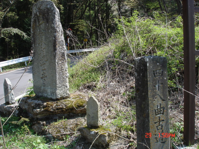 | 四十八曲峠の下の方には、古道の標識と細めの道があった。また、たどってみたい道だ。 | これは、朝に坂城から上山田に入ったあたりで撮った写真だが、八頭山と大林山の位置関係がよく分かる。右が八頭山、左が大林山です。(ここから見ると八頭山の方が近いので高く見えます。) (2008、4,29) |