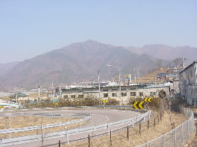 | 上田菅平インターの降り口付近です。正面東太郎山ですが見えている頂上は,大久保山(1230m)で,本当の頂上(1300m)は,もっとはなれないと見えません. | 登り口の送電線鉄塔用の階段付近から。頂上に見えるのは,大久保山です。右側の尾根上を登ります。 | 登り出してしばらく行くと,となりの尾根にある,砥石城などがよく見えてきます。遠景は烏帽子岳です。 |