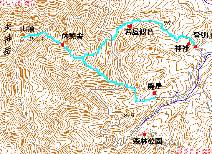 ・登り口から荒れた桑畑を通って神社の裏山を登っていきます。 ・774m付近は、からまつ林、赤松林の中を登っていきます。 ・岩谷堂へは、道から少し左へそれて、道がついています。(地図の岩屋観音は岩谷堂の間違いでした。) ・戻ってしばらく登ると林道へ出ます。 ・地図にはありませんが、岩谷堂の方からの道が、林道と交差する場所と、廃屋の方からの道が林道と交差する場所の中間の林道あたりから、杉林の斜面の中ジグザグに休憩舎まで、林道が続いています。登山道と交差したりしていますが、あまり気にせず林道を行っても、登山道を行っても、適当に行けば、休憩舎まで到達します。 ・休憩舎からは、からまつ林の中をしばらく登り尾根に出ると、頂上は、すぐです。 ・最近、(2006,5)休憩舎から林道をさらに進み、頂上から南に向かう尾根とぶつかる所まで行き、そこから山頂へ登りましたが、これが急坂が無く一番やさしい道です。小さい子でも全く危険がありません。こう登って、従来の道を下ってきてもいいでしょう。山頂から南に伸びる尾根も気持ちがよい道です。 ・車の場合、登り口は、駐車スペースは、2台くらい。森林公園には、ちゃんとした広い駐車場があります。廃屋からの道が林道との交差する場所には、道端に3,4台おけます。これ以上車で登ると登山ではなくなりますし、普通の乗用車では、腹を擦るかも。 ・山頂から青木村夫神へ下る道もあります。 ・コースタイムは,登り口から,休憩も入れ2時間,廃屋からの山道が林道と交差する地点から1時間半あれば,山頂までゆっくり行けると思います。 (この地図は、DGSコンピュータ25000プラウザHi使って表示) |