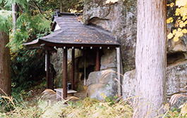 | 岩谷堂は、竹やぶ付近の道から踏み跡を左へ入ってすぐ。お参りも入れ往復5分。登山道は、右です。岩谷堂の上あたりの尾根上へ出ます。 仏様は新しいものでピカピカですが、このような地形に神を祭るのは、独鈷山にもあるので、何か祭った歴史は古いのでは。七久里の里十八景を文晁が描いた額が、常楽寺本堂に掲げられていてそこに、「岩谷堂紅葉」というのがあるようです。 |
