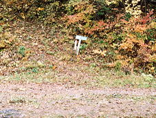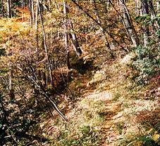 | 登り口まで別所温泉駅から、徒歩30分くらい。 古い青い標識が草に埋もれてあります。(見つからないかも) 沢の手前を右手に登っていきます。 これは、上の方(森林公園の方)から登り口を見ています。 写真の右が別所温泉の方です。 |