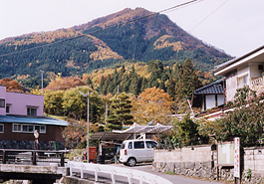 | 駅から、北向観音のある温泉街まで道を歩くと、 夫神岳が間近に見えてきます。 温泉街の中心に有名な北向観音があります。 この辺の紹介は、色々なHPにあることでしょう。写真は平維茂塚(これもちづか・九重石塔)あたりから。この日は、天気が悪くて夫神岳ははっきり写らない。 |