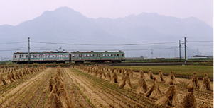 接続する別所線の電車は9:05上田発 電車は、塩田平の田園の中を通っていきます。 進行方向左側に独鈷山がよく見えます。この写真は、雨寸前の時 ですみません。 |