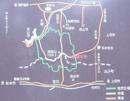 1 西前山からのコース 塩田平の西前山地区からの登山道です。別所線とバスで、麓までのアクセスもあります。沢にそって登り、途中から頂上から北側に派生する尾根に登り、頂上へ到達します。やや危険な部分がありますが、滝や、展望ポイントなど変化もあり、飽きないコースです。塩田地区の公民館登山なども行われるコース。お堂の上の登山口からの標高差約600m。コースタイム約2時間弱。 2 平井寺からのコース 平井寺トンネル有料道路のゲート北の駐車場の下から、林道が東斜面に入り込みます。標高850m付近まで林道が続いています。上田市民登山も行われる。少し危険な部分もありますが、登りやすいコースと思います。林道終点付近登山口から標高差約400m、コースタイム約1,5時間。 3 沢山池(湖)からのコース 4つの中では、一番長いコースです。沢山池から、東西に伸びる主尾根に登り、そこから主尾根を山頂に向かって東へ進みます。登山口が山がかっていますので、一番静かで山深い感じが味わえます。かっては、こちらが市民登山のコースでした。険しくはありませんが、山なれない人にとっては、地図で現在地を大体確認しながら登った方が不安感が無いです。標高差約 650m(累積標高差はさらにある)、コースタイム約2時間強。 4 宮沢からのコース 丸子町の鹿教湯、霊仙寺、温泉方面から登るには、こちら側となります。沢にそってかなり登り、南へ派生する小尾根に登り山頂へ向います。30山表の熊沢峠からの写真を見ると、このコースが俯瞰されます。南斜面で、冬登る人が多そうです。林道終点の駐車スペースから標高差500m、コースタイム約1,5時間。