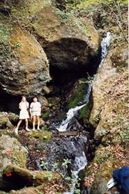 | 中禅寺入口にあるバス停から、西に真っ直ぐ100mほど行くと、独鈷山登山口の看板があります。ここから山へ向かって、進み、突き当たりをちょっと右手にカーブします。中禅寺と前山寺とをくれぐれも間違えないようにして下さいね。 | カーブした所から、左上に上がり、この標識の所から、さらに山に向かいます。ちよっと上り最後の家を過ぎると、小さなお堂があります。ここに、2台くらい駐車できます。さらに、ガタガタ道を上がり突き当たりから、登山道が始まります。ここにも、2台くらい駐車できます。マイカーで来る人たちは、お堂か、この辺に車を置きます。 | 道は、沢にそって、涼しい杉林の中を登って行きます。しばらく行くと、滝があります。以前この滝の流れで、サンショウウオも見たことがあります。左に折れて道は登りますが、春には山の斜面に山吹がたくさん咲きます。 |