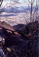 | 落葉樹の林の急斜面をジグザグに道が登っていきます。急で、すべったりして登りづらいですが、危ない場所はないです。 | 6月頃、道端に「たがそで草」の花が咲き乱れていた時もありました。 | 尾根に出ると、塩田(北)側の展望が木々の間から一部見え出します。尾根の上部のトラバース道のような場所を通って(冬はここが北側の急斜面で危険な場所となる)頂上部分の山体へ取り付くと10分ほどで、頂上へ到達です。紅葉の頃もきれいな場所です。 |