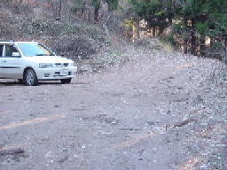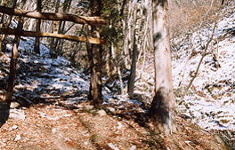 | 三才山トンネルで松本へ抜ける国道254号線、霊仙寺温泉入口のある、宮沢バス停付近にある、登山口の看板から、道を北へ独鈷山へ向かって入ります。標識にしたがい、人家を抜けて、山へ入っていきます。 | 道端の山の畑に独鈷山賛歌という看板がありました。畑の中の農道を登っていきます。農道の終点は、広場になっていて、車が3台くらい止められるようになっています。そこから、沢ぞいに登山道が始まっています。 | 登りだして、すぐに山の神の鳥居があります。道は御屋敷沢にそって登ります。しだいにかれ沢となり、沢と沢の間の尾根のような出っ張った地形についた道を登っていきます。 |