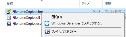 エクスプローラから、ファイルのパス名をクリップボードにコピーします。 インストールすると、下のようにエクスプローラのコンテキストメニュー(右クリックで表示されるメニュー)に、ファイルパスをコピーするための項目を追加します。
