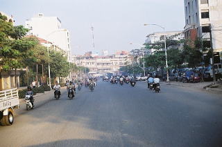 2001年2月6日(火)午前7時30分、プノンペン市街にあるインターコンチネンタルホテルを、専用バスを利用して出発する。カンボジアの朝は早く、平均的出勤時間は午前7時30分ということで、道路は出勤の人でごったがえしていた。カンボジアの交通手段はバイクが多く2人乗り、3人乗りは当たり前。時には4人乗りのバイクを見かけた。バイクの群集の中に車が走り、信号機・横断歩道はほとんどない。バイク・車が往来する隙間をぬって人が走って道路を横断する。よく交通事故が発生しないものだと感心した。申し訳程度に簡易舗装された道路は私たちに適度な揺れを体感させ、まだ眠い目を覚ましてくれた。道路脇には屋台が並び、食事をしている人の姿を見かけた。カンボジア人たちの朝食は大体が外食である。決して清潔とはいえない屋台で好物のカンボジア麺をすする。バスの窓から見える人々の生活は、日本の昭和10年代から20年代頃の風景であろうか・・・一見傾いているような小屋のまわりに牛を放し、私たちのバスを見送る老婆の姿が印象的であった。