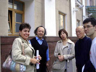 ロシア・ナンバーワンのボリショイ劇場のピアノ演奏者、ガイヤーネさん(左から1番目)です。この方のお取り計らいで、スタニスラフスキー・ネミロヴィッチ・ダンチェンコ記念音楽劇場の方とも話し合いがスムーズにすすみました。 因みに左から2番目の方が山本郁夫先生、3番目が通訳の方、5番目がボディーガードです。 |