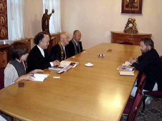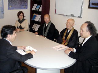 ロシア正教の会議室に通していただきました。お相手していただいたのは、総務部の幹部の方でした。今回の公演にて、ロシア正教の賛美歌と私たちの声明が、一緒にお唱えすることができないだろうかというお願いに行きました。 |