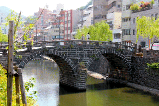 写真:明治期の中島川風景(中島川辺の説明板) 「そんならなお更、おっちゃんに着いてきて欲しか。小川さんのところまで」 「情けなかことば言いなさんな。これからは、何ごとも一人でやっていかなきゃならんのに」 諭されて雲平は、中島川に架かっている橋を指折り数えながらゆっくり歩いていった。橋は、木造のものや石を汲みあげたものなど様ざまである。中には、屋根をつけた橋もある。その橋を坊さんが2人、談笑しながら渡っていった。