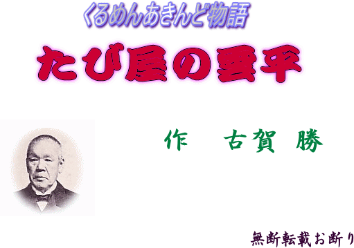 260年間続いた徳川時代は、維新をもってすべて解決というわけにはいかなかった。 雲平が結婚した年(明治7年)の2月には、国の参議を降りて佐賀にあった江藤新平が首領となって、「佐賀の乱」が勃発した。戦いは、佐賀城周辺から福岡県との境にまで拡大し、久留米の町からも銃声が聞こえた。発足したばかりの明善小学校は休校となり、政府軍の負傷者が、校内に設けられた包帯所(病院)に次々と収容された。 新政府に逆らって士族が引き起こす反乱は、神風連の乱(明治9年10月・熊本)、秋月の乱(明治9年10月・福岡県)、萩の乱(明治9年10月・山口県)と、次々に勃発。 鹿児島で点火した西南の役は、日本国内における最大級の内戦へと発展した。この戦争は、雲平の運命をも左右することになる。 「久留米も、戦争に巻き込まれる」 つい先頃、嘉助が話していたことだ。鹿児島の西郷隆盛が決起すれば、政府は全力を傾注して鎮圧にあたるに違いないと。鹿児島から近い熊本か、或いは福岡が決戦の場になるだろう。そうなれば、久留米も戦場に巻き込まれる可能性が大である。 「いずれにしても、商人は命がけの決断ばしなけりゃならんときが来る」 嘉助は、この重大局面にいかに向き合うか、雲平に考えろと促していた。 青々館に出向くと、嘉助が今や遅しと待っていた。 「相手は、陸軍でも偉か人ぞ。何ば言われても、逆らっちゃならん」 雲平の性格を知り尽くしている嘉助は、階段を上る前に念を押した。2階の部屋には、見た目その辺の役所勤めの中年男が、1人で雲平の到着を待っていた。 「こちらは、この度の戦役で軍に必要な物資を調達なさる河野さまであられる。粗相のないように」 嘉助は、河野参謀を紹介すると、雲平の後方に下がった。 「吾輩は、この度の鹿児島の反乱軍を蹴散らすための、後方部隊に所属する。これまでに、兵隊の食いものや着るものを調達してきたが、少々の物資では持ち堪えられそうにない。そこでだ」 細い体型と小さな顔には似合わない大きくて真っ黒などじょう髭が、もの言う度にピクピク刎ねる。 「地元の商い仲間が、河野さまにご贔屓いただいていることは承知しております。ですが...」 「何か、吾輩に文句でもあるのか。まだ、何にも喋ってはおらんぞ」 先程嘉助が言った「何を言われても、逆らっちゃならん」は、この場面だと思った。 「とんでもございません、河野さまに文句など。何なりと言いつけて下さいませ。久留米商人の意地にかけて、薩摩軍との戦闘にお役にたちます」 雲平は、言い過ぎを自覚しながら、途中で止められなかった。 「それでは、申す。よいか、聞き洩らすでないぞ」 河野は、どじょう髭を片方ずつさすり終えると、一気に要件をぶちまけた。 「兵隊が履く草鞋掛け足袋を2万足、それにシャツとズボン下を各1万枚。それらを、向う20日の内に本営まで持参せよ」 河野の口調は、商談というより命令であった。 聞きながら、雲平の体中が硬直していく。「そんな無茶な」と言いたいところだが、後ろに控える嘉助からは、何の助太刀も来ない。 「分かりました。河野さまのお言いつけであれば、必ず期日までに納品させていただきます」 畳に額をこすりつけながら、承知することになった。河野参謀との商談を終えて階下に降りた雲平は、全身から力が抜けて、思わず嘉助の肩に崩れてしまった。