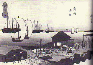 座敷の向こう側では、上役らしい中年の男が、若衆5人と永の別れを惜しんでいた。ここは江戸市中から東海道に出る境目であり、別れの場所でもあった。木戸のあたりにはそのための茶店が軒を連ねている。