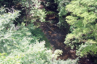 谷間を流れる上野田川の渓谷は、道路から水面まで50b以上もある断崖絶壁。写真に収めたくても、足元が不安定で、動きが取れない。