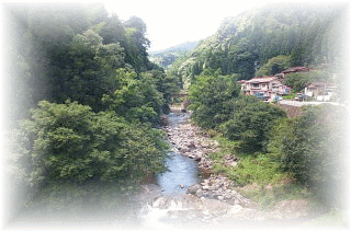 話には聞いていたが、上津江村に入ったとたん、どこまで走っても山ばかり。国道387号にそって川原川が流れているが、谷底を見通すのは無理。激しいせせらぎだけが聞こえてくる。肝心の白草川沿いにあるはずの人斬り谷がどこなのか、同じような景色ばかりでさっぱりわからない。天気はいいし、座り込んで、香代と卯吉、山賊と伝兵衛のやりとりを想像してみたが、山道があまりにも整備されすぎていて実感が湧いてこない。物語を考えるよりも水彩画でも描きたくなった。
