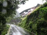 針目城も長岩城も、今は形を残さない。針目山を見上げる杷木町の筑後川沿いを散策し、その足で10`以上はなれた山奥の長岩に登った。合所ダムを過ぎると、景色は現代から一挙に江戸時代へとスリップする。雨上がりのせいもあって、音を立てて流れ落ちる源流では、思わず歓声を上げた。彼岸花で仕切られた棚田群、樹齢400年の大杉に包まれた神社、麦藁家など、子供の頃に遊んだ風景がそのまま残っていた。