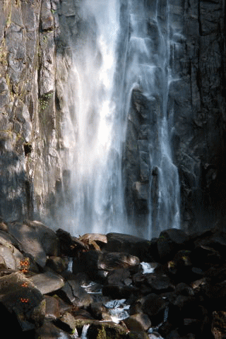 言われるままに雨戸を開けると、目の前に綿帽子みたいな雪を被った孟宗竹が首を垂れていた。権現さまへのお供え銭を入れた風呂敷包みを大切に腰に巻きつけると、夢中で孟宗竹に飛び移った。 写真は、熊野那智大社方面から望む那智の滝