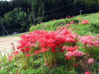 訪ねた時、岸辺も棚田も彼岸花が真っ盛りだった。筑後川の源流の一つ、宝満山の麓は、刈り入れも済んで静かに佇んでいた。
