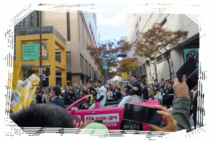 リーグ優勝から日本一へ。駆け登ったホークスナインの祝賀パレードが11月24日福岡明治通で行われた。沿道に集まった県内外のファンは29万人。ボクは博多座の前での参加だったが、天神での賑わいは、それは凄かったらしい。