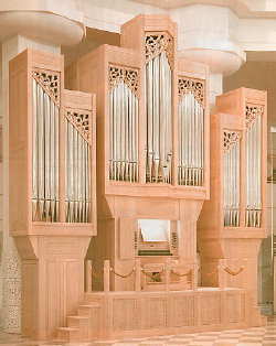 伊丹サンシティホールオルガン仕様 T.Hauptwerk Prinzipal 8' Salicional 8' Gedackt 8' Oktave 4' Flote 4' Superoktave 2' Mixtur V Zimbel U Kornett V Trompete 8' Clairon 4' U.Schwellwerk Harmonieflote 8' Viola di Gamba 8' Vox coelestis 8' Rohrflote 8' Prinzipal 4' Salicet 4' Nasat 2 2/3' Oktave 2' Terz 1 3/5' Quintflote 1 1/3' Sifflote 1' Oboe 8' Vox humana 8' Tremulant Pedal Subbass 16' Oktavebass 8' Flote 8' Fagott 16' Trompete 8' U-T,T-P,U-P メカニカルキー&ストップアクション パイプ数:1696本 調律:キルンベルガーV 製作:シューマッハー(ベルギー) 完成:1993年6月 |