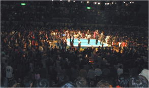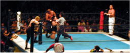 プロレス観戦 2001/3/17(土) 今日は、愛知県体育館で新日本プロレスの観戦です。 私のおめあては第3試合、小原道由・ヒロ斎藤組VS吉江豊・越中詩郎組。ヒロ斎藤のファンなんです。ゴング前からヒロ斎藤組が急襲。タオルを用いたチョーク攻撃に歓声があがる。 マイナーかと思っていたら、意外に人気あるじゃない>ヒロ斎藤 ヒロさんは、この試合に勝ち、またその後のセミファイナルでは天山組の、またメーンイベントにもスコットノートン側のリングサイドに登場してきました。メーンイベントはIWGP選手権試合のため国歌が流されたのだけど、アメリカの国歌が流れたときには拍手までしてました>ヒロ斎藤 セミファイナルは天山組が負けたので、ヒロさんも試合後に乱入できましたが、メーンイベントは佐々木健介ががあっけなくノートンに敗れてしまい、ノートン側にいたヒロさんが出番を失ったのは残念でした。健介にも、もう少しチャンピオンの意地を出して欲しかったな。 って、たぶんヒロ斎藤なんて知らないよね(^^;) ヒロ斎藤 吉江豊 ヒロ斎藤のチョーク攻撃 静観する越中詩郎 ヒロ斎藤国歌斉唱(ヒロ斎藤はリングサイド) |