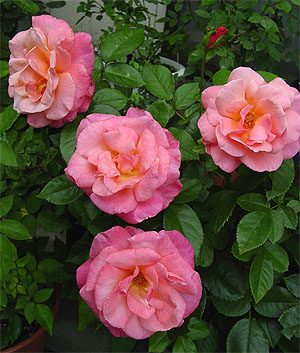 やさしいオレンジピンク色が印象的なバラ。あるカタログで「最高級品」の文字と写真で以前から憧れでした。成長が旺盛で花付きも優秀、よく返り咲き、蕾は濃いオレンジ赤色。