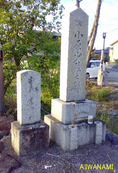 碑は二つあり、小さい方は昭和25年建立で、消えかかって不明確ですが、「小原大尉空中戦死之地」とあるようにも思えます。大きい方は、下記のように昭和30年代に建てられたようです。
