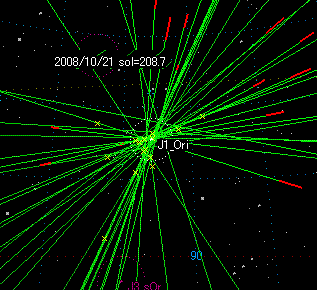 | 10月22日 0時59分8秒 連続して流れたOri群。 | 10月21/22日のオリオン群の輻射点 | 10月22日 2時49分10秒 オリオン群 -2等。 |