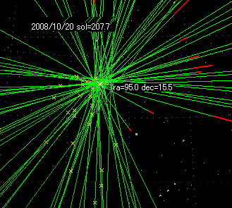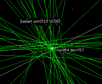 | 10月26/27日のオリオン群の輻射点 | 10月24/25日のオリオン群の輻射点 | 10月24日 23時34分44秒 オリオン群 -1等。 |