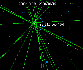 | 10月20日 23時19分3秒 オリオン群 -2.3等。 | 10月19/20日のオリオン群の輻射点 | 10月20日 4時52分44秒 平行に流れるOri群。 |