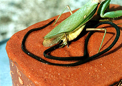 カマキリの羽を少し針でどかして撮影しました。カマキリのおしりからハリガネムシが脱出している様子がよく分かります。