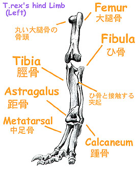 上右はティラノサウルスの左後ろ足です。ひ骨と接触するための耳たぶのような突起が脛骨(すねの骨ですね)にあること、距骨が三角形であることに注意してください。