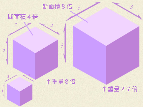 上の図を見れば分かるように物体の縦と横、高さの比率が同じように2倍になるのなら断面積は4倍、重量(体積)は8倍になります。3倍になるのなら断面積は9倍、重量、あるいは体積は27倍になります。ようするに断面積はサイズの2乗に、重量は3乗に比例して増えるわけですね。