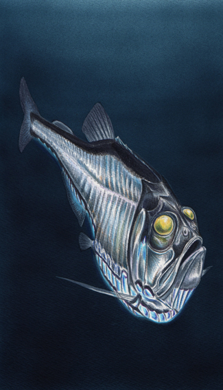 また、テンガンムネエソ属の中で黄色い水晶体を持つのは、正しくはナガムネエソ(Argyropelecus affinis)でした。テンガンムネエソのより妥当なイラストは以下左、右側は同属別種で黄色い水晶体を持つナガムネエソのイラストです。