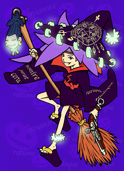 2004年10月30〜31日の 黒いハロウィンわらしちゃん 2004年10月30〜31日の間だけトップを飾ったわらしちゃん。魔法陣を描いた帽子をかぶりハロウィンの空を飛びます。 背景と服の文字はラテン語で insanire parat certa ratione modoque これはなにかいい言葉はないか?と北村が「ギリシャ・ラテン 引用語辞典」岩波書店 1937 をめくっていたらみつけた言葉。意味は、 彼は確かなる理性と方法とをもって発狂の用意をなす ←わらしちゃんギャラリーに戻る