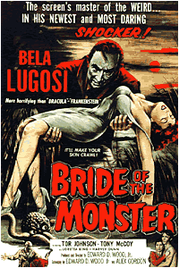 史上最低の映画『プラン9・フロム・アウタースペース』の前に製作された、これまた最低な映画である。ベラ・ルゴシはまだ生きていた。 「『怪物の花嫁』の舞台裏は全く狂気の沙汰だった。いくらか金が集まると、それでフィルムを何巻か買い、ルゴシにギャラを払ってモルヒネを買えるようにしてやり、その上で数日だけ撮影する。すると金がなくなる。撮影を中断して金集めに飛び回る。すべてがこんな調子だった。だから映画が完成する頃には誰にどれだけの金を払わなければならないのか、まるで判らなくなっていた」(ロバート・クレイマー。ベラ・ルゴシの伝記作家) この頃のベラ・ルゴシは、モルヒネ中毒の上に、長年連れ添った妻には逃げられ「我が生涯最悪の時」にあった。或る晩、ルゴシに呼び出されたウッドは拳銃を手にする彼を目撃した。 「晩年のルゴシを助けようとする者は誰もいなかった。エド・ウッド以外にはね。本当に彼だけだったんだ」(同上) |