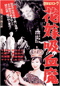 或る映画のヒロインに抜擢された主人公、嫉妬にかられた女優仲間に崖から突き落とされ、顔面に見るも無惨な傷を負う。女優としての再起は不能で、失意のうちに実家に帰るが、そこでも母が借金苦で自殺していた。度重なる不幸に落胆した彼女も自害。しかし、陰陽師のババアの余計なお世話で、彼女は「花嫁吸血魔」として蘇り、崖から落とした連中の新婚初夜を襲うのであった.....。 という、とりわけて取り柄のないC級ゲテモノ映画であるが、この映画がカルト化しているのにはわけがある。「花嫁吸血魔」を演じるのが池内淳子だからである。 三越の評判美人店員から新東宝に入社、女優へと転身した池内淳子は、お嬢様役の清純派として堅実に成長していった。ところが、女優としてこれからという時に、社長である大蔵貢の忠告を無視して結婚引退。そして、大方の予想通りにすぐに離婚。社長を拝み倒して、復帰第1作としてもらった役がこれだったのである。 ところで、本作には『狼男アメリカン』もびっくりな「ワンカット変身」のシーンがある。苦しみもがく池内の顔がみるみるとドス黒く変色していくのだ。これは思うに、黒インキのスプレーを顔に吹き掛けているのだろう。文字通りの汚れ役だ。このシーンの池内は、物凄く嫌そうな顔をしている。 |