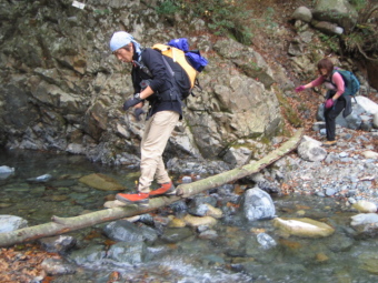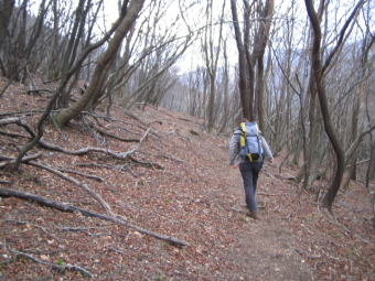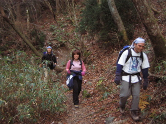| 寒いのでさっさと歩き出す。目の前の雨乞岳本峰へは笹の快適な尾根が続く。 ボクも先頭に立つとついつい走ってしまうのは何故?^^; あっというまに雨乞岳(1238m)に到着。こちらは狭い頂上で展望も東方面くらい。 せっかくの頂上なのでしばらく休憩。しかし寒くなって下山開始。下りはいったん北側の杉峠を目指す。 右手にむかし雨乞いをしたといわれる池を見ながら笹のブッシュを越えていく。 すぐにしっかりした踏み跡にかわる。気持ちのよい尾根もつかの間、急下降になる。 下りきったところが杉峠。その名のとおり杉が数本立っていた。 そこからは東に折れ下っていく。あいかわらずTやんは走る走る^^; しばらく下ると宴会にぴったりの場所に到着。ここが鉱山跡のようだ。あたりは石垣が積み上げられている。 2時間一本勝負の鍋宴会開始。全員ヨッパライに変身。。 鉱山跡からは神崎川の源流域の美しい雑木林を下っていったはずだが なぜか全員全力疾走・・・^^; 何故?? なごPが「でへへへへ〜」って叫びながらおっかけてきた?? それを見てharumiちゃんとこてっちゃんが逃走? Tやんはあいかわらず先頭で暴走?? あまり覚えてません。。 酔っ払い恐るべし。 コクイ谷との出合で小休止、ここでようやくクールダウン。 相変わらずなごPは暴発してるが。 今度はコクイ谷を遡っていく。 何度か谷を飛び石で渡りながら進んでいく。 すると先頭を行くTやんが足を滑らし転倒。右半身水没・・・^^; さぶっ。。 可哀想やけどおもしろい!! 同じような光景を1年前も見たような・・・ ・・・昨年の回想 もしかしたらと思い隠れて後続を待つ。案の定、こ○っちゃんが足を滑らし両足水没! 人の失敗を見るのはとても楽しい^-^ その後も道をはずして際どい高巻きをしたり、Tやんの転倒顔面ヒットなど見物。 盛りだくさんな内容で登山口に到着。春以来の本格ハイキングを堪能しました。 このコースは全体的に自然林の美しい森が続くので紅葉の頃にまたきてみたいなと思いました。 |