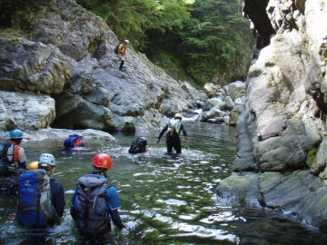 | 某1名を除き出発準備ちう | 吊橋下から遡行開始 |