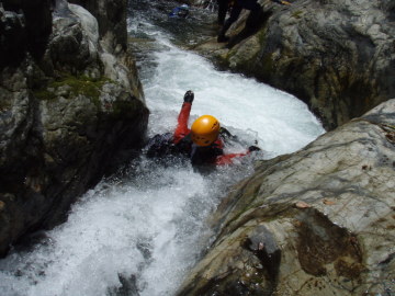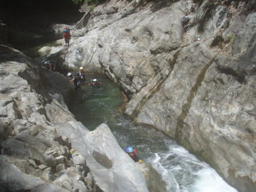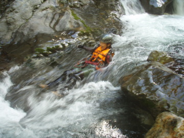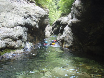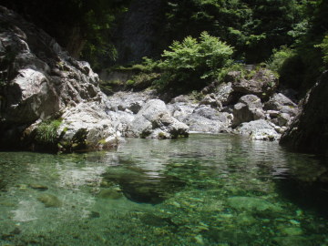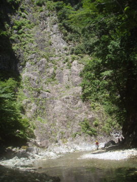 | 二重滝は下段3mと上段3mの滝で構成されていて真ん中に渦巻く釜がある。 ここでもやまと氏はハッスルしてささっとTOPで登り後続のフォローをしている。今日はあなたが主役だ。がんばってください。 下段の滝を左側から登り中間で右側に渡ってから上段の滝を越える。 このあたりからいよいよ変化にとんでくる。変化と言うても構成してるのは渕と小滝と河原に変わりないが。 とにかく泳がないといけない場所が続く。 足が使えない泳ぎが苦痛だ。 もうあっぷあっぷ。 てるぴは故障してないけどあっぷあっぷしてるようで他の人に掴まりながら泳いではる。 次の3m滝は左の壁をへつってから登るが右膝に力が入らないのでやまと氏に泣きながらロープを要請。 滝上はおにぎり岩が谷のど真ん中に鎮座していた。近づいてみるとスズメ蜂の巣があったので逃げる。 そこからも泳いで泳いで泳ぎまくり。手だけで泳いでる僕はもう勘弁して〜状態(;◇;) 右から不動小屋谷が入るのを見るとまもなくやはり右手に林道が下りてきた。 しかし、ここからもまだまだ一筋縄ではいかない。 泳いで取り付くところが何箇所か出てくるが今の僕には苦行そのものだ。 途中面白そうなウォータースライダーがあったので滑ってみる。こういうのは楽しい♪ そのあとは両岸が狭まって長渕が50m続く。もうほんまに勘弁してください〜(>◇<) さてそろそろ中ノ川出合も近いかなといったころ最後の難関、引木滝5mが登場。 やまと氏は何も言わずとも勝手に左壁にロープを張ってくれる。あなたはエライ! 全員登ってると時間がかかるので林道側にI会長がロープを張ってそちらから登るチームとわかれる。 僕はピンの回収の為やまと氏ルートを登る。 最初の取り付きがやっかいなのでとがちゃんにショルダーでフォローしてもらい一段あがる。サンキューです。 あとは斜上して滝上へ出る。滝上には石橋状の変わった岩があった。その先には中ノ川へ入る仕事道の吊橋が見えている。 (この岩橋は地元では「龍橋」と呼ばれてるそうです:夢水さんから情報いただきました) 中ノ川出合は10m滝になっているので少し手前の斜面から吊橋にあがる。 これで今回の行程は終了! 僕にとってはあまり癒しではない沢登りだったが暑い夏に気持ちよく涼むことができた。 林道を少し戻っていくとだいぶ回復したMATさんがクルマで迎えにきてくれていた。ありがとう〜♪ MATさんにはとんだ沢納めになったようです。 来年の夏はおたがい健康体でやり直しに来ましょう〜 今回ご一緒していただいたみなさん楽しい1日をありがとうございました。 |