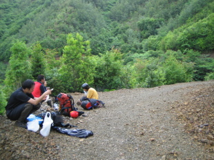 | イバラでボロボロになりながらもやっとこさ落ち口におりて休憩。 渓相は穏やかになったがすぐに15mが現れた。少し戻り左岸から巻き開始。再び薮に突っ込む。 落ち口と同じ高度まで上がるが近づけないのでもう少し上まで登る。 最後は懸垂下降で落ち口へ。そこからもう1段あがると50mナメが続いている。 ここで核心部は終了のようだ。想像してたよりはすんなり来る事が出来た^^ あとはだらだらと適当なテン場を探しながら歩く。 しばらく行くと丁度いい河原があり、テン場に決定^^ まだ13時なのに宴会スタート^^; ひさびさに哲ちゃん鍋をつつきながら焚火を見てると眠たくなってきた^^ 15時くらいにはみんなお昼ねタイム^^ しばらくして3人組のパーティがあがってきたが今日は詰めて本谷へ抜けるらしい。 さっさと通り過ぎて行った。今回会ったのはこのパーティだけだ。 17時ころに雨がぽつりぽつりと頬をたたいたので寝床に帰って本格的に爆睡態勢をとる。 その後、他の3人は2次会をしてたみたいだが僕は普段の睡眠不足がたたり、朝の6時まで寝てしまった。 朝起きて「谷中で15時間寝たのは記録やでえ」と言われてしまう^^ゞ 起きると雨はほとんど止んでいた。 やまとさんと哲ちゃんは寝床をヒルに襲われて1時間おきに目が覚めてたらしい^^; 僕はぜんぜん平気やってんけどなあ。。となりにヒル除けのかっきーが寝てたからか…? どんよりした空のした出発準備。これ以上詰めても面白くなさそうなのでここから退却する事に決定。 右岸の踏み跡らしき場所に突っ込む。またまたイバラ攻撃。痛い痛い^^ 薮の中をかすかな踏み跡をたどって急斜面を上がっていく。 雨あがりの斜面ではあちこちでヒルが元気に踊っている。 取りついてきたら塩をぶっかけたろうと思ったけど殺気を感じたのか一匹もつかなかった^^; 伐採地に出て鹿よけフェンスを2回越えて尾根にあがる。 進路を南にとり884.7mピークからは南西の尾根に入り林道に下り立つ。 そこからは林道沿いに大谷橋まで下っていくだけだ。 近畿地方が今日梅雨入りしたと聞いたのは帰ってからだった。 |